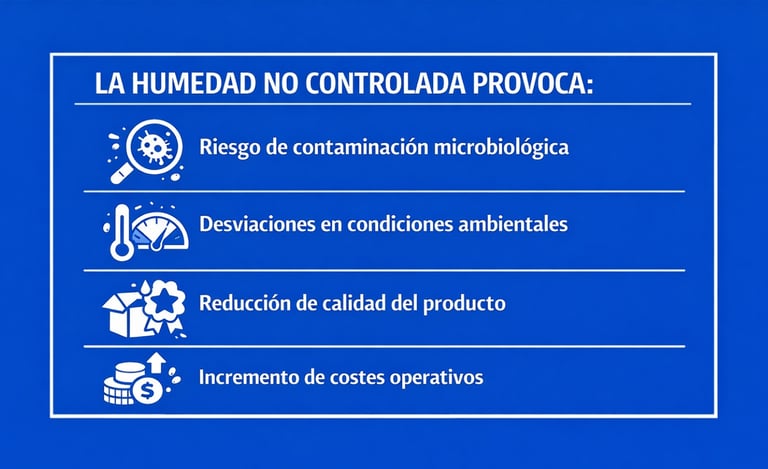 Las desviaciones en humedad pueden provocar condensaciones, proliferación microbiológica y alteraciones en las condiciones ambientales críticas, afectando directamente a la producción.